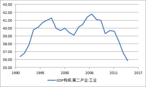 但是,过去的5年里,出口增长从之前的年增速20-30%降到5%以内,而今年更是出现负增长。随着出口需求的放缓,传统强项第二产业工业在GDP中的占比逐年下滑。